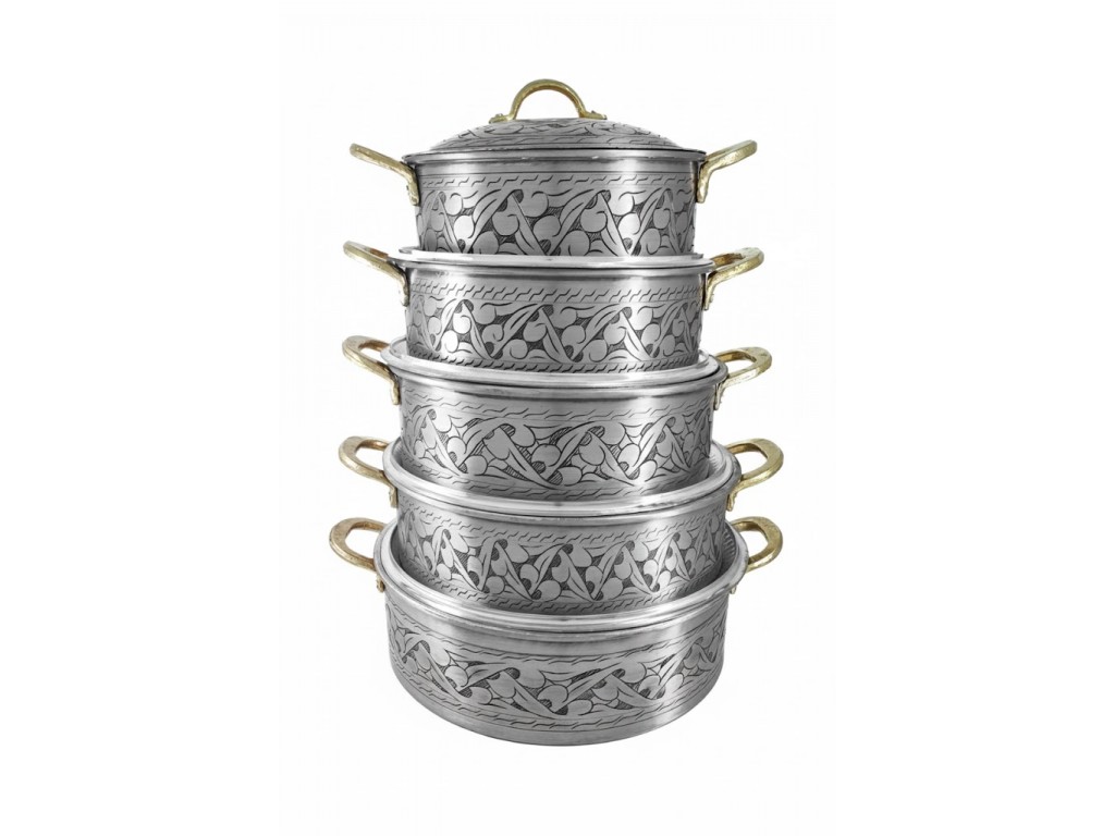 5’li bakır karnıyarık tava, oyma işleme beyaz dış yüzeyi ile hem fonksiyonel hem de estetik bir mutfak ürünüdür. Özellikle karnıyarık, imam bayıldı, dolma ve benzeri geleneksel yemekler için özel olarak tasarlanmıştır. Bölmeli yapısı sayesinde aynı anda 5 adet yemeğin eşit şekilde pişmesini sağlar.